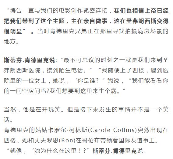拍摄的过程充满奇妙,神在医院四楼给肯德里克兄弟组织了一个会晤