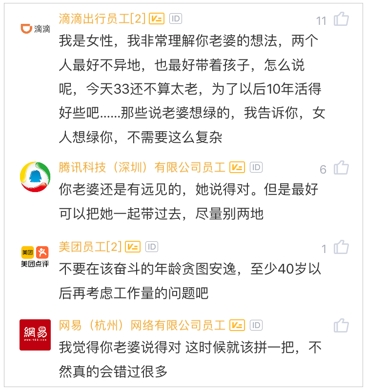 有网友站在女性的角度说:我是女性,我非常理解你老婆的想法,两个人最好不异地,也最好带着孩子,怎么说呢,今天33还不算太老,为了以后10年活得好些吧……那些说老婆想绿的,我告诉你,女人想绿你,不需要这么复杂