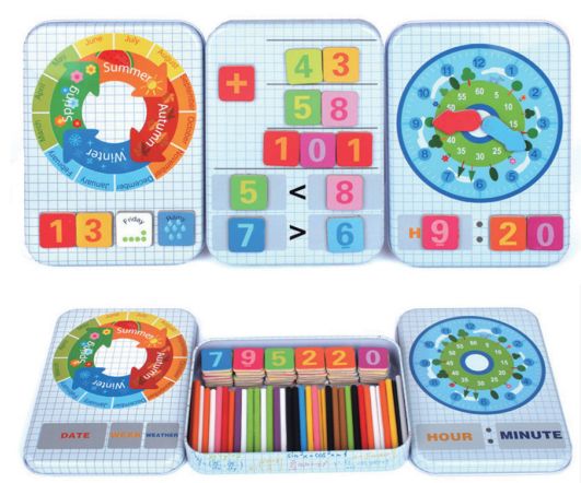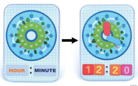 时钟外壳可以模拟时间,让孩子自己操作,想到几点就将指针划到对应位置吧。