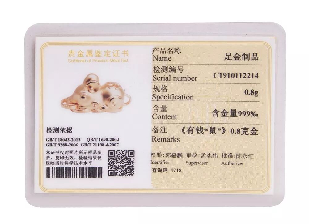 每个产品都会带有第三方机构开具的贵金属检测证书一份。