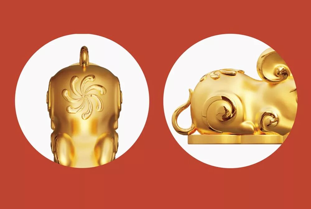 金鼠的口中,还咬着一枚钱币,寓意着鼠年财源广进。