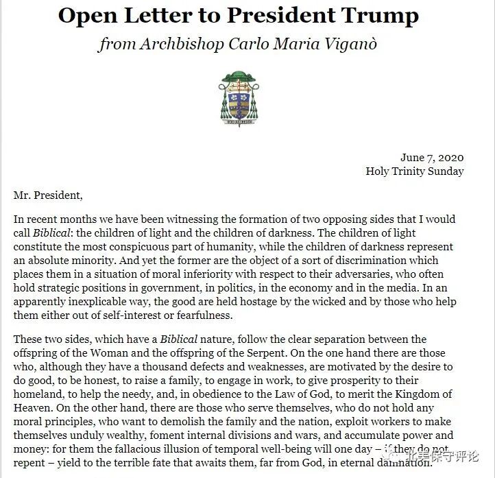 鉴于美国目前的骚乱,不仅普通美国人发声,连天主教驻美国的大主教卡洛‧玛丽亚‧维加诺也忍无可忍,他公开了他写给川普总统的一封信。