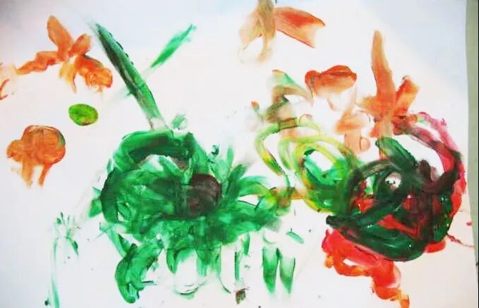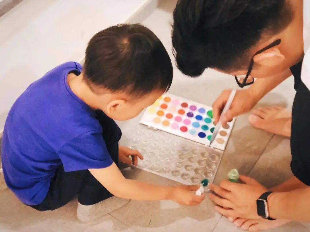 首先是专注力。画画的时候非常需要投入,年糕每次开始画,都充满热情,自己捣鼓颜料画笔能玩半个小时。