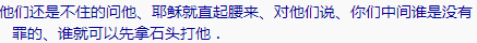 “你们中谁是没有罪的”——实际上,主耶稣的意思是:“你们中谁未曾与这妇人行淫的”。祂的意思是:你们中谁未曾与她行淫的,可以先拿石头打她。