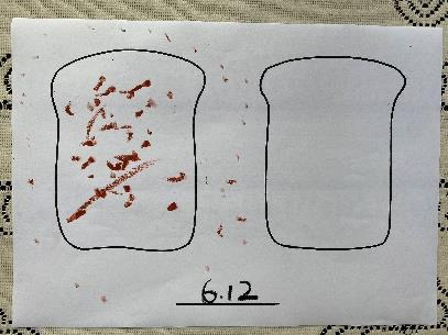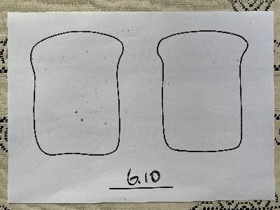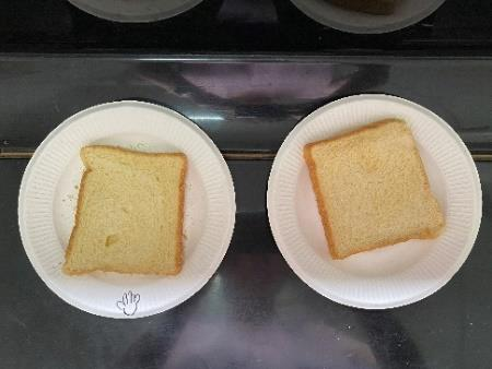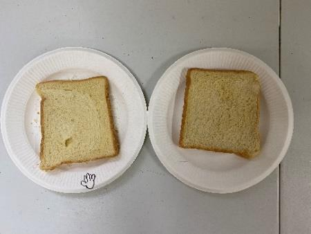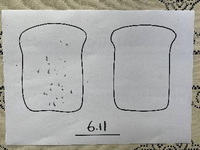 我们将这两片面包分别放在同样的纸盘子内,将放着被小手摸过的面包的盘子上画上黑黑的小手作为记号,另一个盘子则不做别的记号。