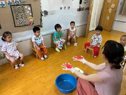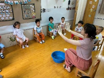 老师戴上第二幅橡胶手套,挤一点“洗手液”到手心,一边哼唱“洗手歌”,一边运用正确的洗手方式进行洗手。请孩子们观察,双手每个角落是否都已涂上“洗手液”?