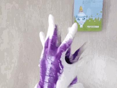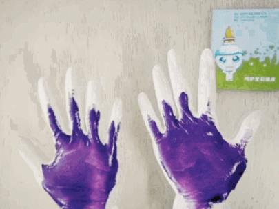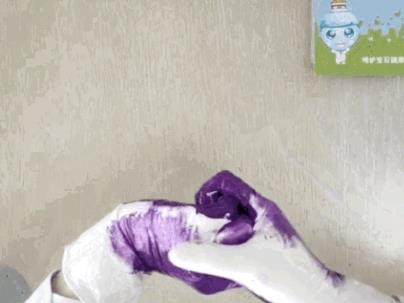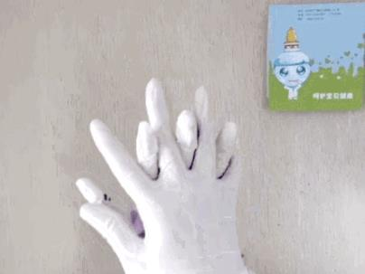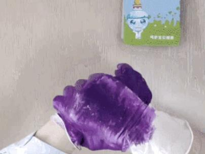 老师戴上第一副橡胶手套,挤一点“洗手液”到手心,模仿一般洗手的步骤洗手,即完成。请孩子们观察,有没有用“洗手液”把小手的每一个小角落都涂到呢?