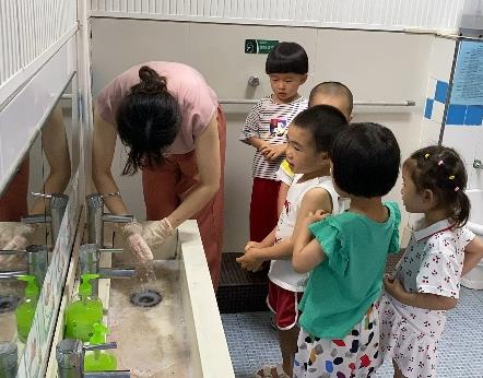 当双手都已正确涂满洗手液后,还需要将洗手液用流动的清水全部清洗干净,因此,老师分批带领孩子到卫生间,观看老师彻底将“洗手液”清洗干净。