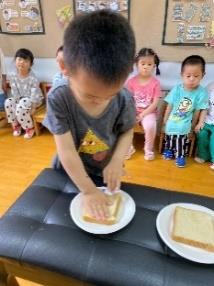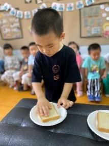为了能让孩子们更直观地发现“小手上的脏东西”,老师带着孩子们一起,做了一个有趣 的实验:首先,我们准备了两片同一包装内的切片面包(超市购买,并且在保质期内),其中一 片请每一位小朋友用小手摸一摸,另一片则没有被小手摸过。