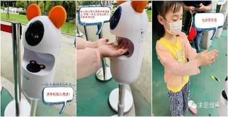 幼儿园门口,多了两个“新朋友”——自动感应洗手机, 它在感应到小朋友们的小手后,会自动“吐”出免洗洗手液, 小朋友只要将泡泡洗手液在手上反复揉搓,就能把小手洗干净。
