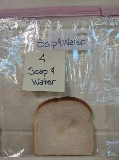 一位美国的小学老师准备了五片吐司进行对比观察——第一片则没有用手摸过、第二片让小朋友先用温水跟肥皂彻底把手洗干净以后再摸、第三片让小朋友先用酒精干洗手液清洁手后才摸一下、第四片让小朋友用没有洗过的手摸一下、第五片直接在教室电脑的表面抹一下,然后把这五片吐司分别用密封袋装起来,静置 3-4 周以便更好地观察。