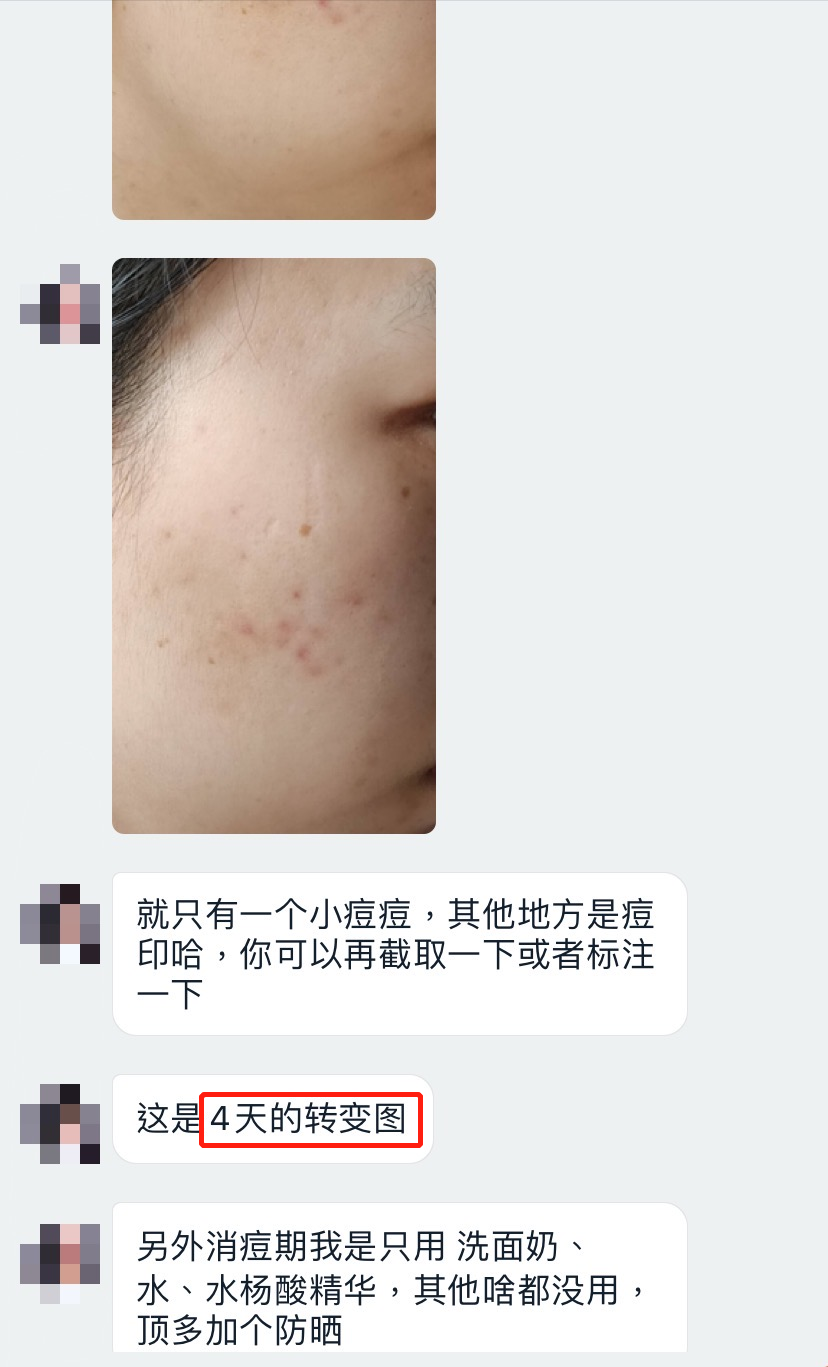 试用反馈:使用了 4 天能明显感受到痘痘瘪下去了,整体肤色也有改善。
