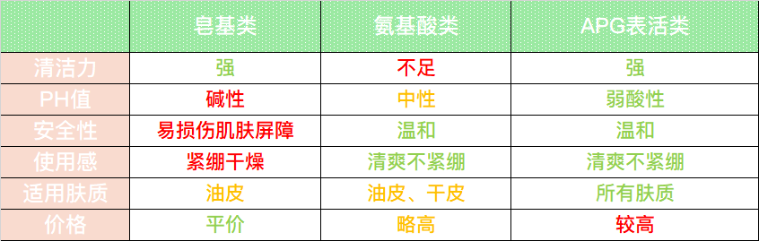 洗面奶怎么挑?首先我们来看看洗面奶的常见类别;市面上的洗面奶,按清洁原理,大致分为皂基类、氨基酸类、APG表活类 3 种;用红黄绿灯示意如下: