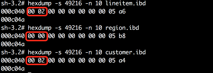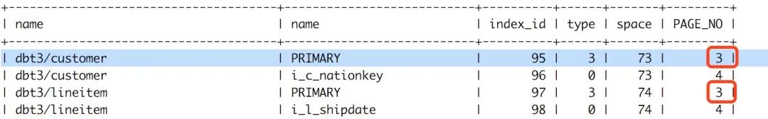 可以看出数据库dbt3下的customer表、lineitem表主键索引根页的page number均为3,而其他的二级索引page