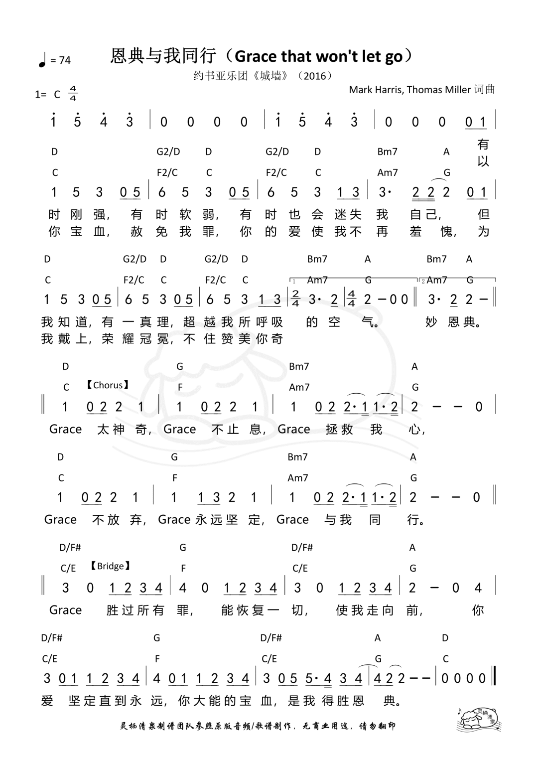 恩典与我同行 / GRACE THAT WON’T LET GO 词曲Written by / Thomas Miller & Mark Harris 中译词 Translated by / 周巽光Ewen Chow 演唱Artist / 曾晨恩 Joseph Tseng 有时刚强 有时软弱 有时也会迷失我自己 但我知道 有一真理 超越我所呼吸的空气 Grace太神奇 Grace不止息 Grace拯救我心 Grace不放弃 Grace永远坚定 Grace与我同行 以你宝血 赦免我罪 你的爱使 我不再羞愧 为我戴上 荣耀冠冕 不住赞美 你奇妙恩典 Grace 胜过所有罪 能恢复一切 使我走向前 你爱 坚定直到永远 你大能的宝血 是我得胜恩典