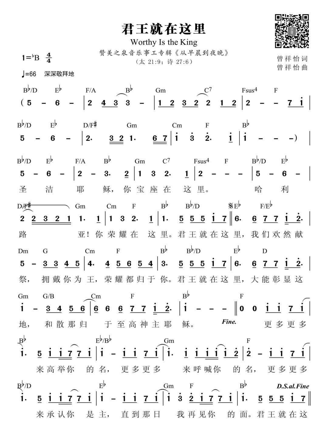 +- 首页 赞美之泉 正文 音频播放地址: 视频播放地址: 君王就在这裡 Worthy Is the King 词,曲: 曾祥怡 Grace Tseng © 2017 Stream of Praise Music / BMI. CCLI: 7125334 赞美之泉版权所有 圣洁耶稣 你宝座在这裡 哈利路亚 你荣耀在这裡 君王就在这裡 我们欢然献祭 拥戴你为王 荣耀都归于你 君王就在这裡 大能彰显这地 和散那归于至高神主耶稣 更多更多来高举你的名 更多更多来呼喊你的名 更多更多来承认你是主 直到那日 我再见你的面 歌谱: 儿童敬拜1儿童敬拜2儿童敬拜3儿童敬拜4儿童敬拜5儿童敬拜6儿童敬拜7赞美之泉 收藏 分享 链接