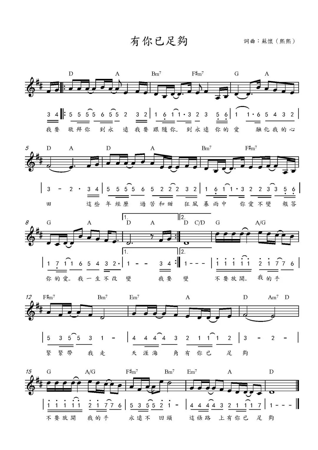 +- 首页 敬拜赞美诗歌 正文 有你已足够 点击收听 ©️ 苏怀(熙熙) 授权 唱新歌 发布 有你已足够 滑动查看歌词 作词:苏怀(熙熙)作曲:苏怀(熙熙)演唱:苏怀(熙熙)我要敬拜你到永远我要跟随你到永远你的爱融化我的心田这些年经历过苦和甜狂风暴雨中你爱不变报答你的爱我一生不改变不要放开我的手 紧紧带我走天涯海角有你已足够不要放开我的手 永远不回头这条路上有你已足够 RECOMMEND 歌谱 ♬ 唱新歌 | 每天一首诗歌 长按识别二维码关注 小提示: 唱新歌,开通流量主啦~,您的每次点击都是对我们的支持与祝福,让我们更有力量去收集好听的诗歌! 敬拜赞美诗歌灵修语丝讲章精选大公信经新教经典国度祷告国际新闻休闲旅游 ONEWORSHIP 收藏 分享 链接