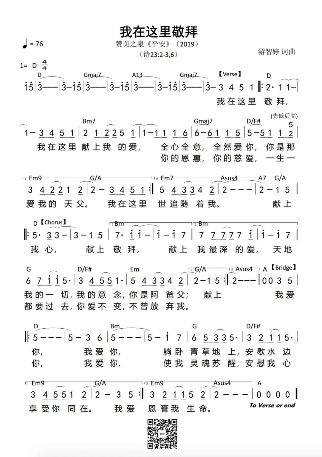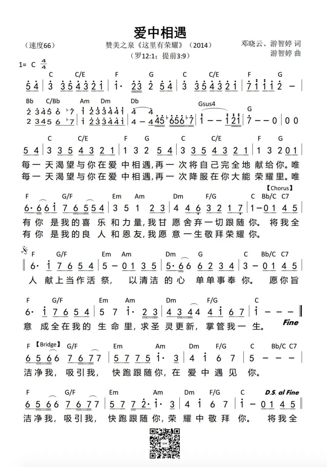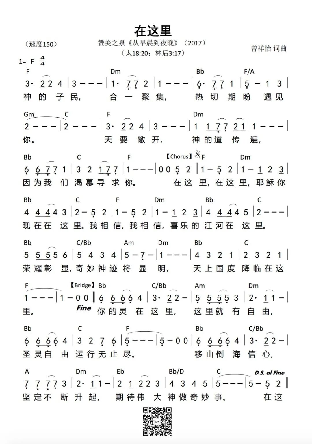 1· 在这里 神的子民 合一聚集 热切期盼遇见祢 天要敞开 神的道传遍 因为我们渴慕寻求祢 在这里 在这里 耶稣祢现在在这里 我相信 我相信 喜乐的江河在这里 荣耀彰显 奇妙神迹将显明 天上国度降临在这里 神的子民 合一聚集 热切期盼遇见祢 天要敞开 神的道传遍 因为我们渴慕寻求祢 在这里 在这里 耶稣祢现在在这里 我相信 我相信 喜乐的江河在这里 荣耀彰显 奇妙神迹将显明 天上国度降临在这里 祢的灵在这里 这里就有自由 圣灵自由运行无止尽 移山倒海信心 坚定不断升起 期待伟大神做奇妙事 在这里 在这里 耶稣祢现在在这里 我相信 我相信 喜乐的江河在这里 荣耀彰显 奇妙神迹将显明 天上国度降临在这里 荣耀彰显 奇妙神迹将显明 天上国度降临在这里 2· 十字架 词:郑懋柔 Tiffany M. Cheng 曲:游智婷 Sandy Yu [Verse] 耶稣背负十架 为我担当过犯 毫无保留为我舍命在十架上 祢受鞭伤 我得医治 祢受刑罚 我得自由释放 [Chorus] 十字架 十字架 耶稣以爱覆盖我 十字架 十字架 祢宝血为我流下 十字架 十字架 我得救赎的记号 十字架 十字架 是我永远的荣耀 [十架为我荣耀] 十字架 十字架 永是我的荣耀 我众罪都洗清洁 唯靠耶稣宝血 3· 爱中相遇 每一天 渴望与你在爱中相遇 再一次 将自己完全的献给你 唯有你 是我的喜乐和力量 我甘愿舍弃一切跟随你 每一天 渴望与你在爱中相遇 再一次 降服在你大能荣耀里 唯有你 是我的良人和恩友 我愿意一生敬拜荣耀你 — 副歌 — 将我全人献上当作活祭 以清洁的心单单事奉你 愿你旨意成全在我的生命里 求圣灵更新 掌管我一生 洁净我 吸引我 快跑跟随你 在爱中遇见你 洁净我 吸引我 快跑跟随你 荣耀中敬拜你 4·我在这里敬拜 我在这里敬拜 我在这里献上我的爱 全心全意 全然爱祢 祢是那爱我的天父 我在这里敬拜 我在这里献上我的爱 祢的恩惠 祢的慈爱 一生一世追随着我 献上我心 献上敬拜 献上我的一切 我的意念 祢是阿爸父 献上敬拜 献上我最深的爱 天地都要过去 祢爱不变 不曾放弃我 我爱祢 我爱祢 躺卧青草地上 安歇水边 享受祢同在 我爱祢 我爱祢 使我灵魂苏醒 安慰我心 恩膏我生命