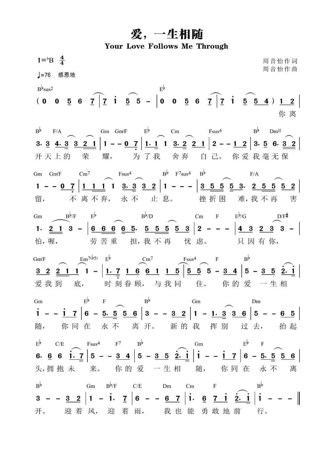+- 首页 生命河灵粮堂 正文 音频播放地址: 视频播放地址: 爱 ,一生相随 词曲:周音怡 Melody Zhou 作者/生命河传播处 版权所有 QZA3A2000015 你离开天上的荣耀 为了我 舍弃自己 你爱我 毫无保留 不离不弃 永不止息 挫折困难 我不再害怕 喔 劳苦重担 我不再忧虑 只因有你 爱我到底 时刻眷顾 与我同住 你的爱一生相随 你同在永不离开 新的我挥别过去 抬起头 拥抱未来 你的爱一生相随 你同在永不离开 迎着风 迎着雨 我也能勇敢地前行 歌谱: 赞美诗歌未整理以斯拉盛晓玫祝瑞莲生命河灵粮堂小羊诗歌Jesus Image天韵合唱团新酒使命团我心旋律JLSS BlessedThe Hope佳音 ONEWORSHIP 收藏 分享 链接