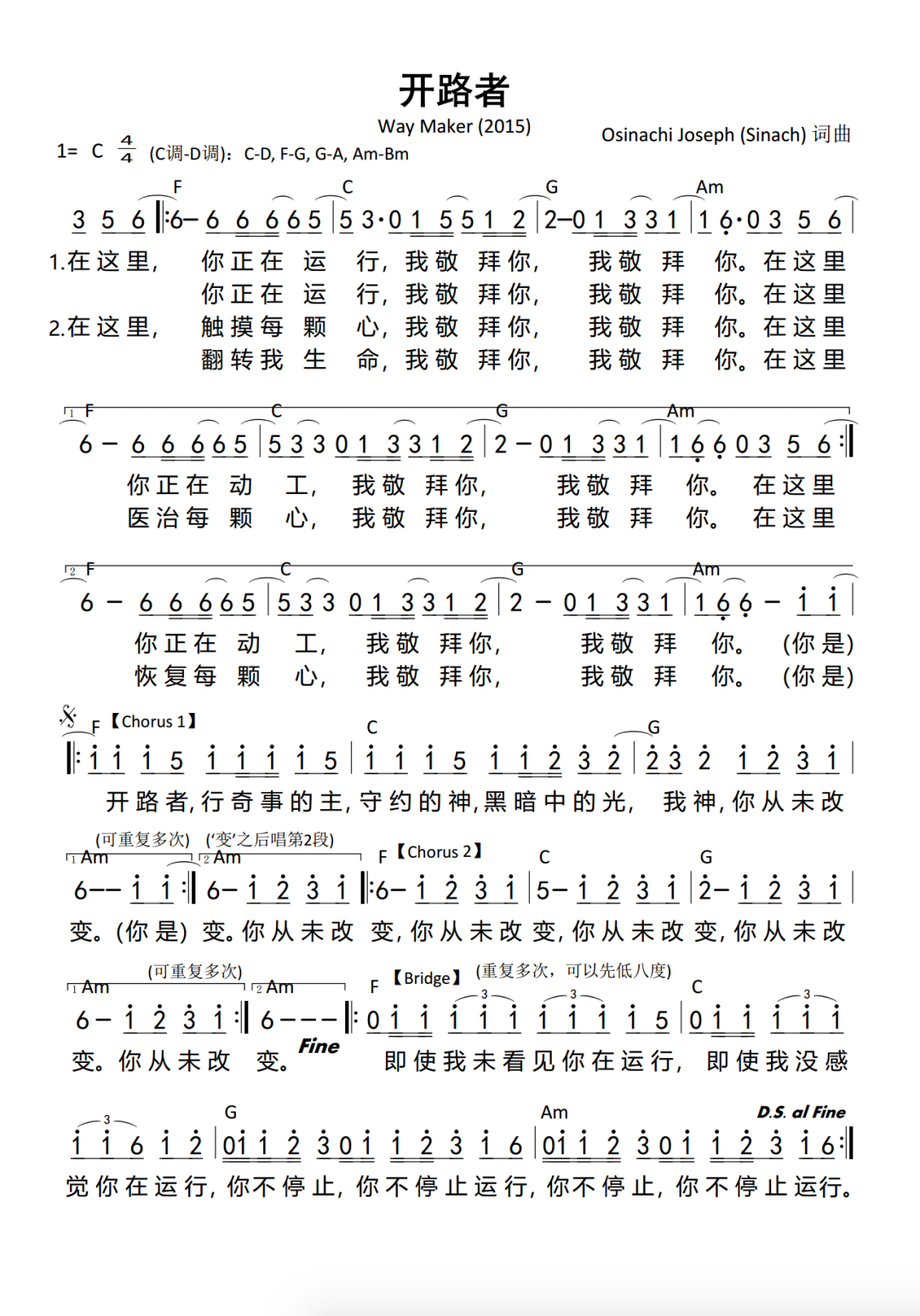 +- 首页 赞美诗歌 正文 音频播放地址: 视频播放地址: Youtube播放地址: 开路者 way maker 在这里 你正在运行 我敬拜你 我敬拜你 在这里 你正在动工 我敬拜你 我敬拜你 在这里 触摸每颗心 我敬拜你 我敬拜你 在这里 医治每颗心 我敬拜你 我敬拜你 开路者 行奇事的主 守约的神 黑暗中的光 我神 你从未改变 你从未改变 你从未改变 你从未改变 你从未改变 你从未改变 你从未改变 你从未改变 你从未改变 即使我未看见你在运行 即使我没感觉你在运行 你不停止 不停止运行 你不停止 不停止运行 歌 谱 赞美诗歌未整理以斯拉盛晓玫祝瑞莲生命河灵粮堂小羊诗歌Jesus Image天韵合唱团新酒使命团我心旋律JLSS BlessedThe Hope佳音 赞美之门 收藏 分享 链接