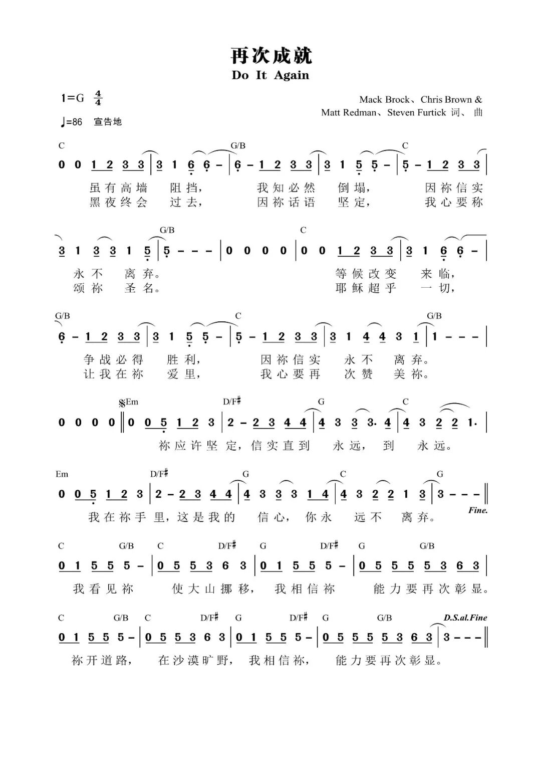 +- 首页 敬拜赞美诗歌 正文 © CROSSMAN 再次成就Do It Again 再次成就 Do It Again 词、曲:Mack Brock、Chris Brown、 Matt Redman、Steven Furtick 滑动查看歌词 / 虽有高墙阻挡 我知必然倒塌 因祢信实永不离弃 等候改变来临 争战必得胜利 因祢信实永不离弃 祢应许坚定 信实到永远 到永远 我在祢手里 这是我的信心 你永远不离弃 黑夜终会过去 因祢话语坚定 我心要称颂祢圣名 耶稣超乎一切 让我在祢爱里 我心要再次赞美祢 我看见祢使大山挪移 我相信祢能力要再次彰显 祢开道路 在沙漠旷野 我相信祢能力要再次彰显 歌 谱 歌谱:D调のC和弦 播放视频 敬拜赞美诗歌灵修语丝讲章精选大公信经新教经典国度祷告国际新闻休闲旅游 ONEWORSHIP 收藏 分享 链接