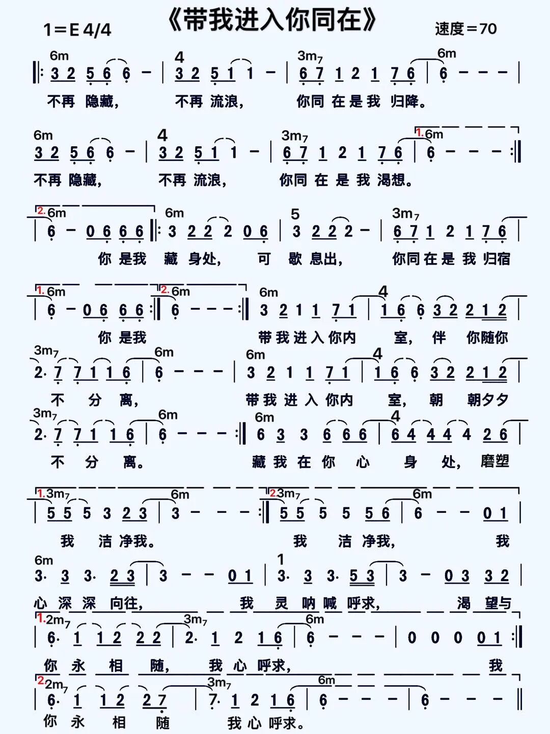+- 首页 敬拜赞美诗歌 正文 ©慕主音乐 | NewWine 带我进入你同在 Take Me Into Your Presence 歌 谱 带我进入你同在 不再隐藏 不再流浪 我的心全然归降 不再隐藏 不再流浪 你同在是我渴想 你是我藏身处 可歇息处 你同在是我归宿 带我进入你内室 伴你随你不分离 带我进入你内室 朝朝夕夕不分离 藏我在你心深处 磨塑我 洁净我 我心深深向往 我灵呐喊呼求 渴望与你永相随 我心呼求 我心呼求 词曲:New Wine 演唱:慕主音乐 敬拜赞美诗歌灵修语丝讲章精选大公信经新教经典国度祷告国际新闻休闲旅游 ONEWORSHIP 收藏 分享 链接