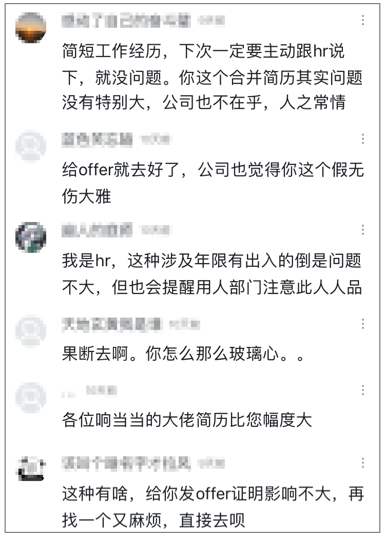 还有网友说:这没什么啊,发offer很正常啊,一家小公司的短暂工作年限加到上一家虽然不是值得鼓励的行为,但是如果职业年限没有明显加长,你同一行业五年,你最后写成10年那就肯定会被拒。