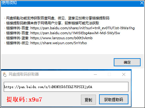 2.提取码只能匹配主流的百度云盘、微云、蓝奏云分享链接格式,软件有样例说明;