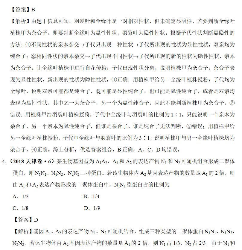 ①测交:若只有一种表型出现,则为纯合子(体);若出现两种比例相同的表现型,则为杂合体;