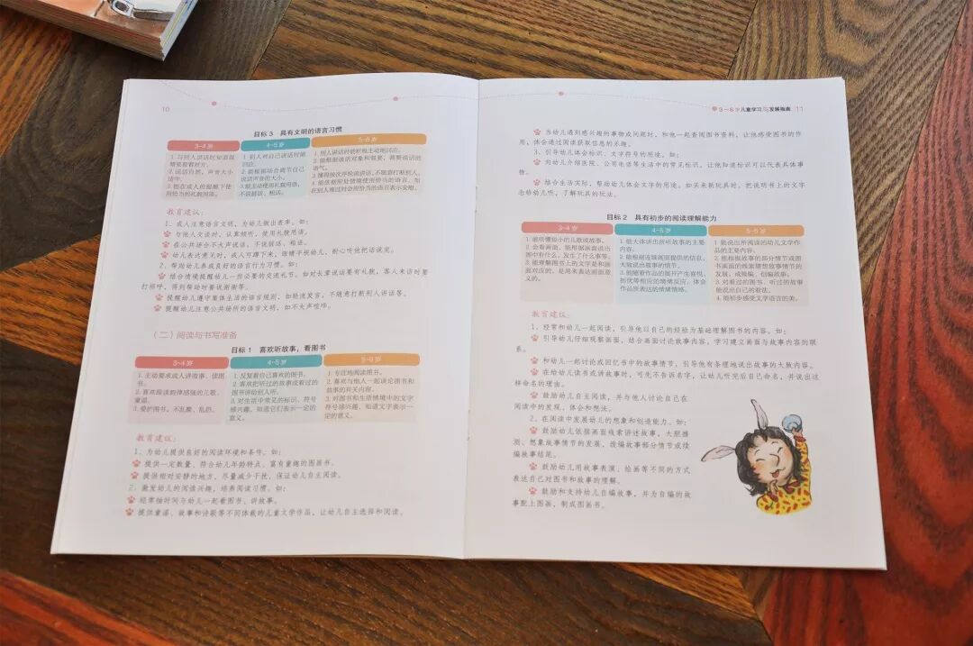 本套书还附赠了3-6岁儿童学习与发展指南,是由中华人民共和国教育部制定,分别对3-4岁、4-5岁、5-6岁三个年龄段,孩子在幼儿园应该知道什么、能做什么、大致可以达到什么发展水平提出了合理期望,指明了幼儿学习与发展的具体方向。
