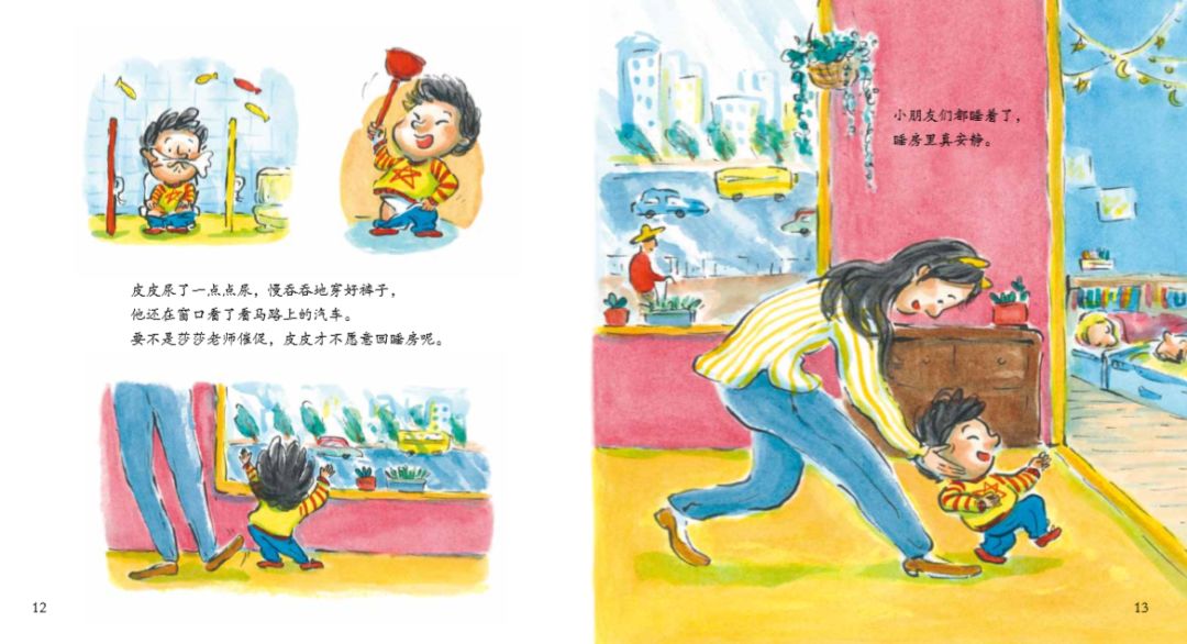 午睡时间到,大家都乖乖地躺在了小床上,只有皮皮睡不着,翻来覆去,去趟厕所,还是睡不着呀睡不着。后来,在莎莎老师的歌声里,皮皮终于睡着了,他做了一个美梦,但是这个梦却被熊熊打破了。