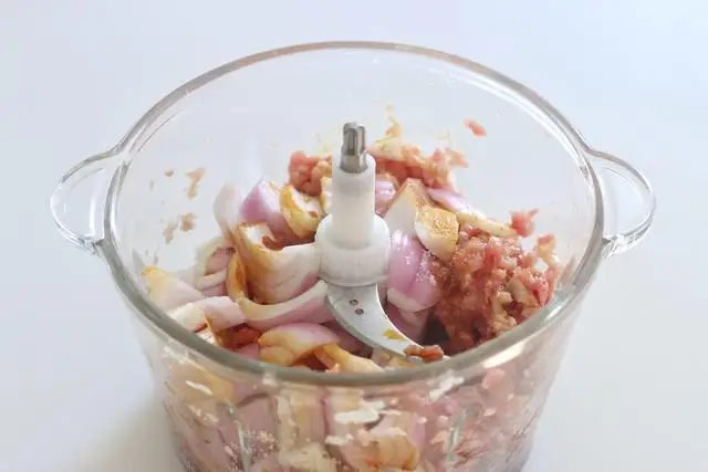 4、启动绞肉机,只需十几秒锅,猪肉和洋葱全部绞成了泥状,特别细腻,猪肉和洋葱你中有我,我中有你,浑然一体。