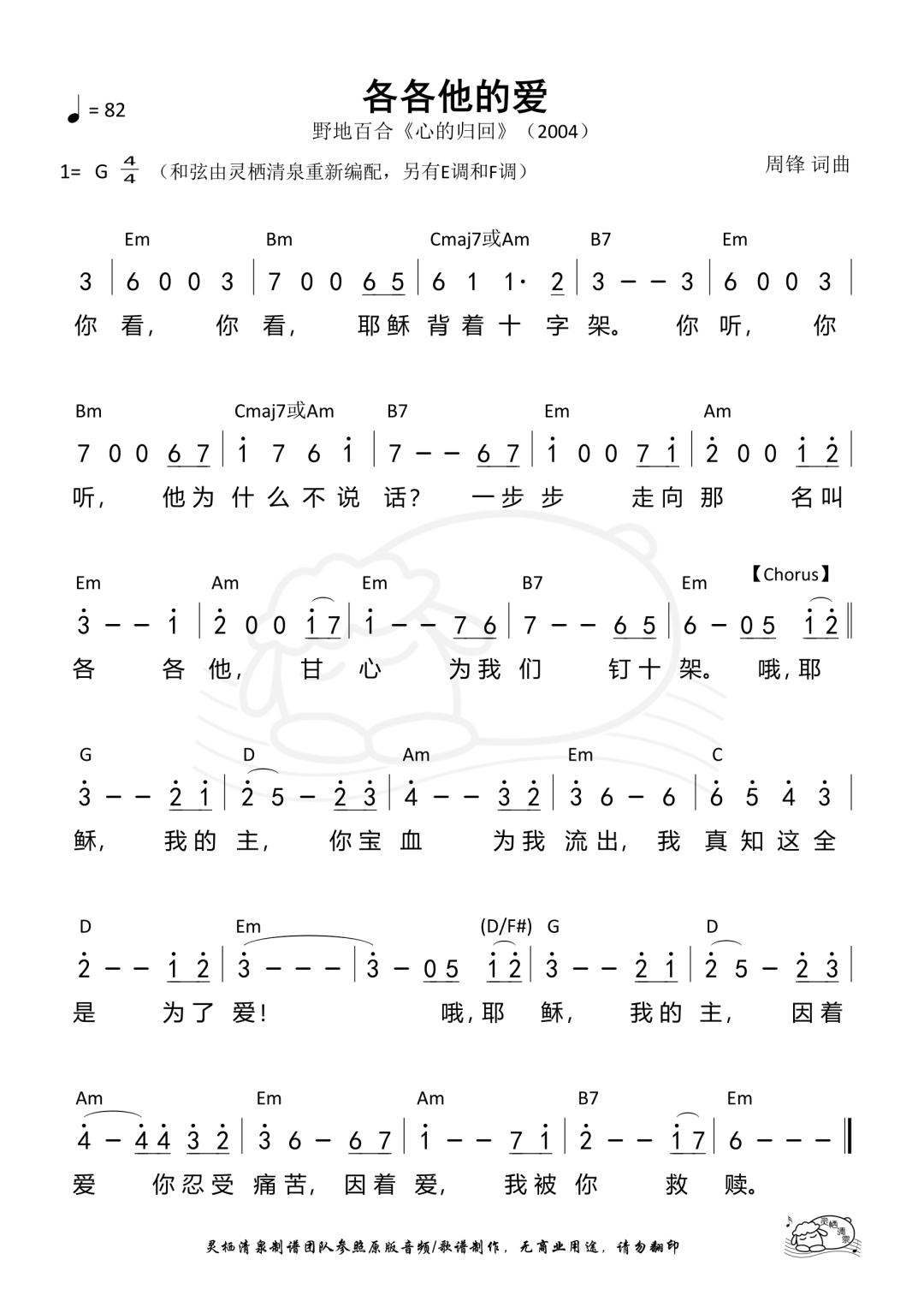 +- 首页 赞美诗歌 正文 音频播放地址: 词曲:周锋 你看 你看 耶稣背着十字架 你看 你听 祂为什么不说话 一步步 走向那 名叫各各他 甘心为我们钉十架 噢 耶稣 我的主 祢宝血为我流出 我真知这全是为了爱 噢 耶稣 我的主 因着爱 祢忍受痛苦 因着爱 我被祢救赎 歌谱(E调): 歌谱(F调) 歌谱(G调) 赞美诗歌未整理以斯拉盛晓玫祝瑞莲生命河灵粮堂小羊诗歌Jesus Image天韵合唱团新酒使命团我心旋律JLSS BlessedThe Hope佳音 赞美之门 收藏 分享 链接
