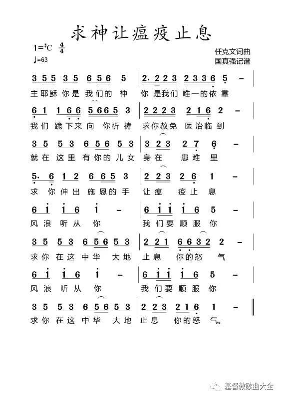 主耶稣你是我们的神 你是我们唯一的依靠 我们跪下来向你祈祷 求你赦免医治临到 就在这里有你的儿女 身在患难里 求你伸出施恩的手 让瘟疫止息 风浪听从你 我们要顺服你 求你在这中华大地 止息你的怒气 风浪听从你 我们要顺服你 求你在这中华大地 止息你的怒气 ☆★☆间奏 ☆★☆ 主耶稣你是我们的神 你是我们唯一的依靠 我们跪下来向你祈祷 求你赦免医治临到 就在这里有你的儿女 身在患难里 求你伸出施恩的手 让瘟疫止息 风浪听从你 我们要顺服你 求你在这中华大地 止息你的怒气 风浪听从你 我们要顺服你 求你在这中华大地 止息你的怒气 风浪听从你 我们要顺服你 求你在这中华大地 止息你的怒气 风浪听从你 我们要顺服你歌谱: