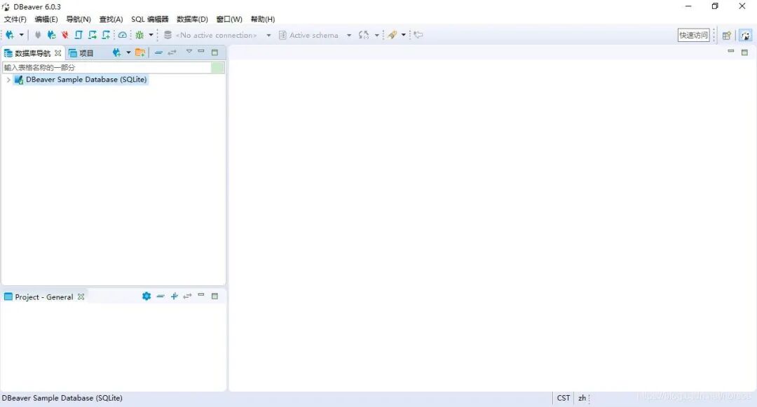 DBeaver 和我们常用的软件类似,最上面是菜单项和快捷工具,左侧是已经建立的数据库连接和项目信息,右侧是主要的工作区域。