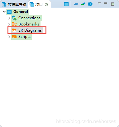 最后介绍一下如何生成数据库对象的 ER 图。点击窗口左侧“数据库导航”旁边的“项目”视图。