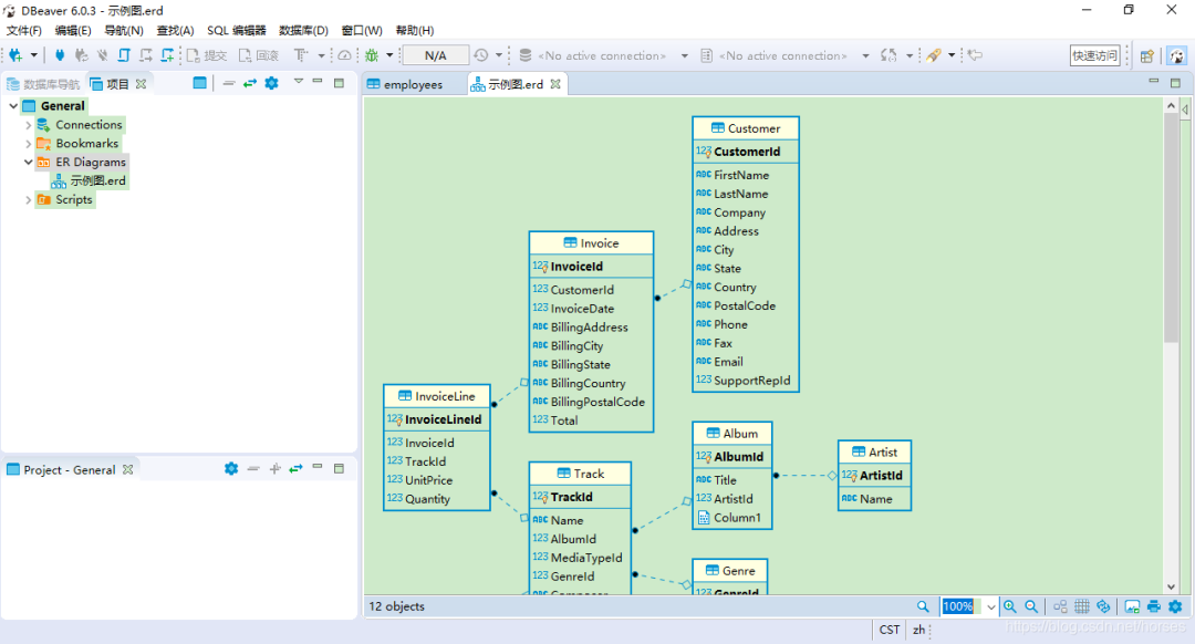 ER 图可以进行排版和显示设置,也支持打印为图片。DBeaver 目前还不支持自己创建 ER 图,只能从现有的数据库中生成。