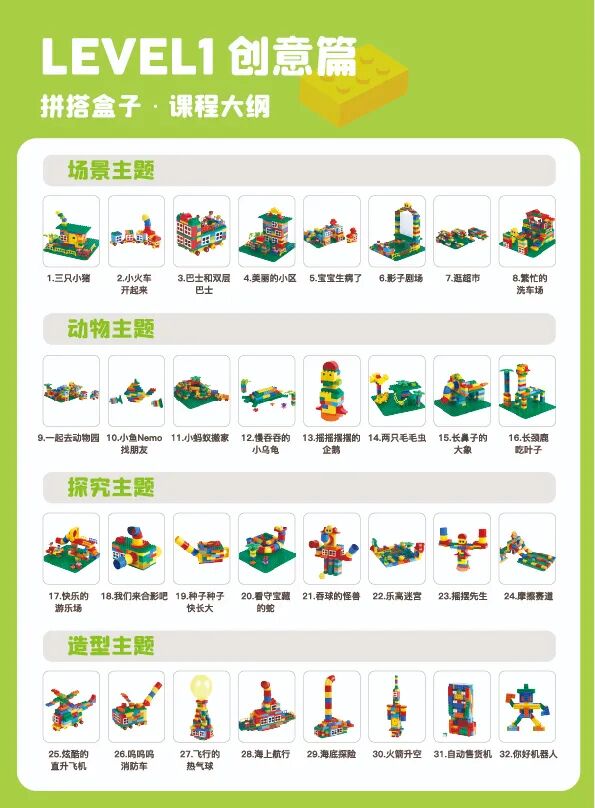 这一阶段的课程,以具象场景造型为主,宝贝将学习基础结构和搭建技巧,通过有趣的故事、场景,发挥想象力,完成作品搭建。
