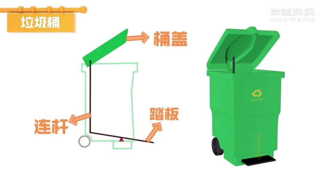在搭建中,带着孩子一起去探索脚踏式垃圾桶背后的复合杠杆原理。