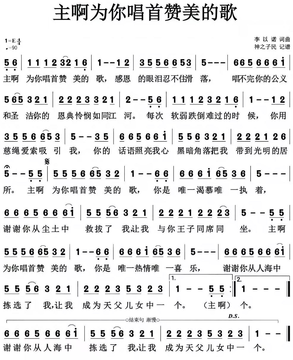 +- 首页 赞美诗歌 正文 音频播放地址: 视频播放地址: Youtube播放地址: 词曲:李以诺 编曲:刘炫宇 后期:刘炫宇 主啊为你唱首赞美的歌 感恩的眼泪忍不住滑落 唱不完你的公义和圣洁 你的恩典怜悯如同江河 每次软弱跌倒难过的时候 你用慈绳爱索吸引我 你的话语照亮我心黑暗角落 把我带到光明的居所 主啊为你唱首赞美的歌 你是唯一渴慕唯一执着 谢谢你从尘土中救拔了我 让我与你王子同席同坐 主啊为你唱首赞美的歌 你是唯一热情唯一喜乐 谢谢你从人海中拣选了我 让我成为天父儿女中一个 歌谱: 赞美诗歌未整理以斯拉盛晓玫祝瑞莲生命河灵粮堂小羊诗歌Jesus Image天韵合唱团新酒使命团我心旋律JLSS BlessedThe Hope佳音 赞美之门 收藏 分享 链接