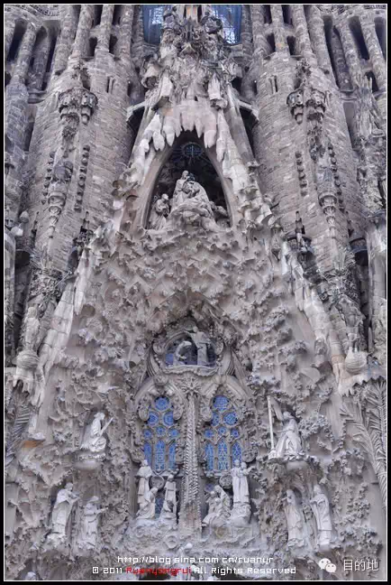 ▲“耶稣诞生”这是高迪生前亲自完成的唯一的一个立面,高迪将它安排在教堂东方,自有其喻义;每早由东方升起的太阳照耀著“诞生立面”,代表著生生不息的奇迹