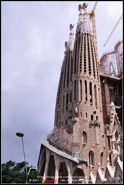 ▲当我们有幸见到这座圣家族大教堂时,这座宏伟的建筑物它确实是和高耸入云的老吊车密不可分,它的周围,特别是南面,还有高处都一直搭建着脚手架和围挡,还时不时有身穿红色工装的工人在上面作业