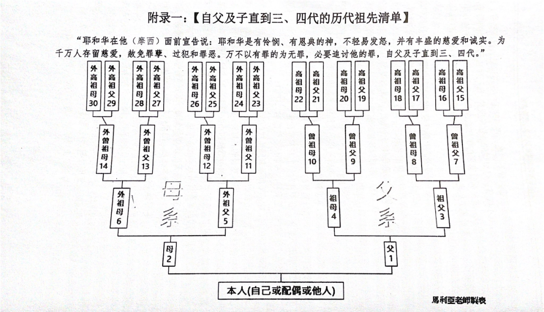 亲爱的主耶稣基督,我现在要站在我父系母系前三代每一位祖先生命的破口中来认罪。就是站在我父亲的祖父、祖母,就是我的曾祖父、曾祖母;站在我父亲的外祖父、外祖母,就是我的曾祖父、曾祖母。站在我母亲的祖父、祖母,就是我的外曾祖父、外曾祖母;站在我母亲的外祖父、外祖母,就是我的外曾祖父、外曾祖母。