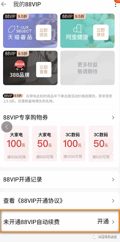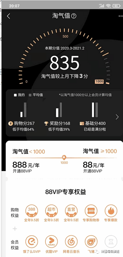 接下来说说这个88VIP会员的准入资格,感觉就是个坑,上面写时淘气值小于1000分时,开通费用为888元/年,因为这段时间转战京东了,所以淘气值降低到了835分,我以为不满足它的88门槛,应该会到期自动停止会员服务。