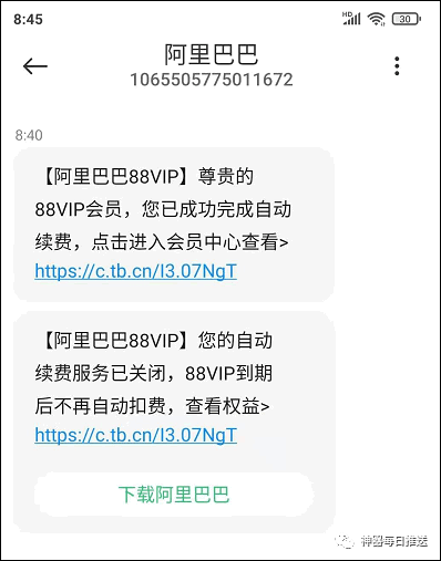 早上收到阿里巴巴的短信,自动扣款续费88VIP会员,自动从银行卡上划走了88元。其实,体验了一年88VIP会员后,早就不打算续费了,就是降低到30元也没兴趣了。