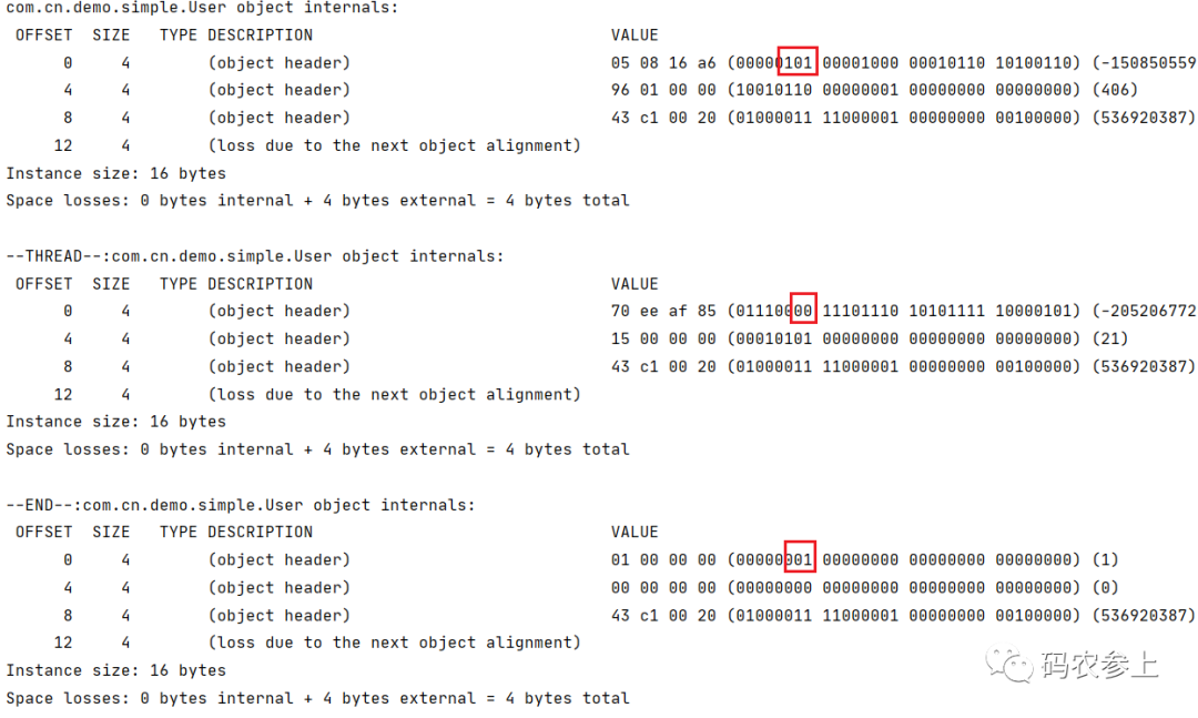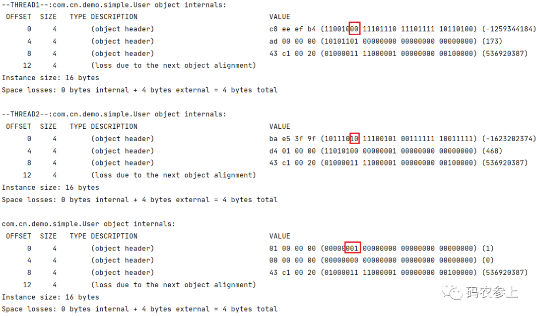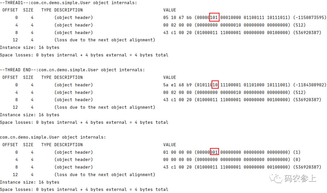 System.out.println("--THREAD END--:" + ClassLayout.parseInstance(user).toPrintable());