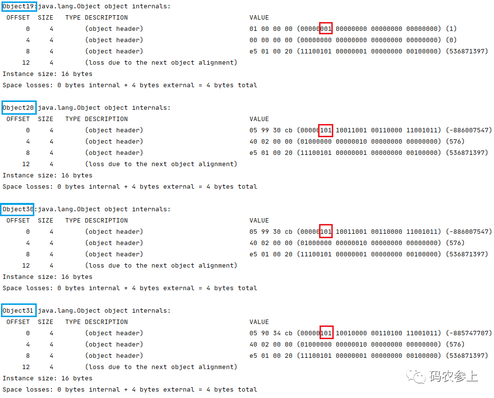 System.out.println("Object20:"+ClassLayout.parseInstance(list.get(19)).toPrintable());