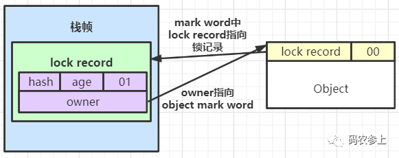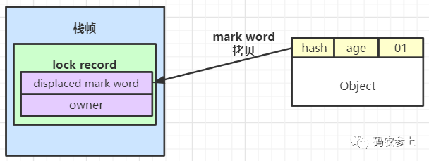 2、在拷贝mark word完成后,首先会挂起线程,jvm使用CAS操作尝试将对象的 mark word中的 lock record 指针指向栈帧中的锁记录,并将锁记录中的owner指针指向锁对象的mark word