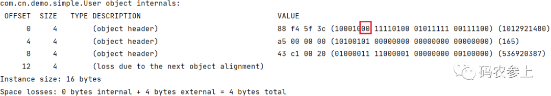 System.out.println("--MAIN--:" + ClassLayout.parseInstance(user).toPrintable());