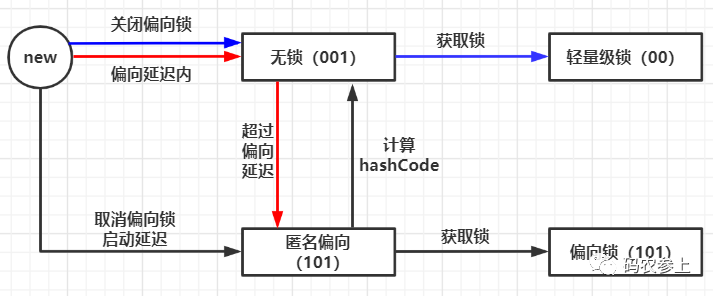 准确来说,无锁可偏向状态应该叫做匿名偏向(Anonymously biased)状态,因为这时对象的mark word中后三位已经是101,但是threadId指针部分仍然全部为0,它还没有向任何线程偏向。综上所述,对象在刚被创建时,根据jvm的配置对象可能会处于 无锁 或 匿名偏向 两个状态。